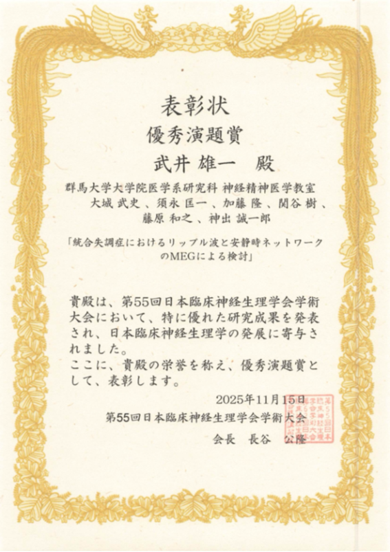 当グループから複数の演題を出しましたが、統合失調症における脳磁図(MEG)を用いたリップル波および安静時ネットワーク解析に関する研究が評価され、優秀演題賞を受賞しました。会場では、解析手法の新規性や臨床的意義について活発な質疑が行われ、他施設の研究者からも多くの建設的なご意見をいただくことができました。