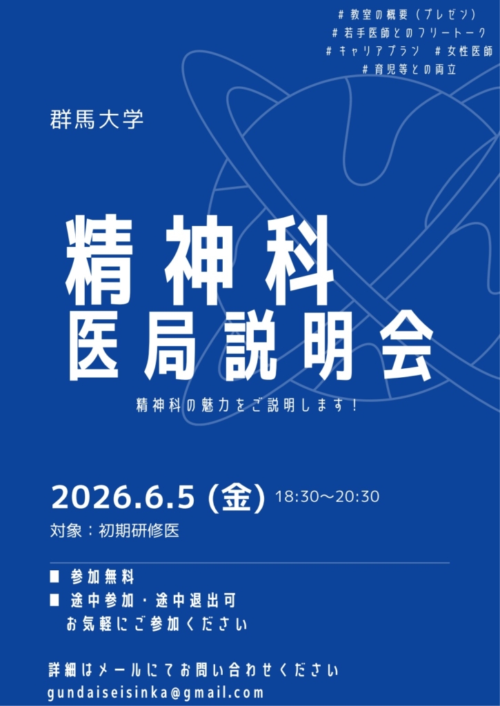 本説明会では、当教室の診療・教育体制の概要や、精神科医としてのキャリア形成についてご紹介するとともに、若手医師との意見交換の機会を設けております。
